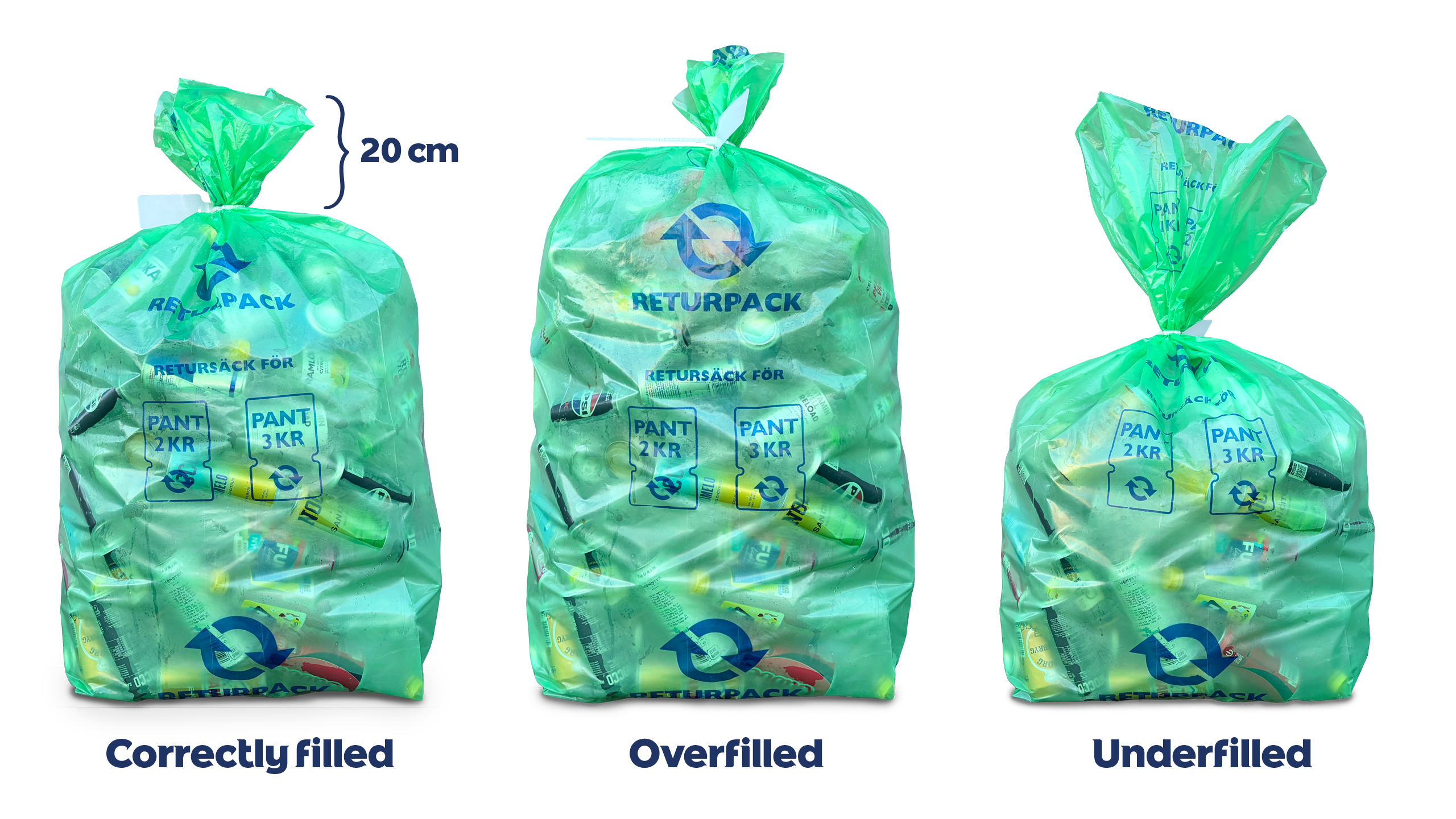 - Each bag must be filled so that approximately 20 cm remains to the top of the bag when it is sealed. The bag must be sealed using Returpack/Pantamera seals and labelled with a tag — these are ordered via Mina Sidor (see section 3). Below is an example of a correctly filled bag, as well as an underfilled and an overfilled bag.