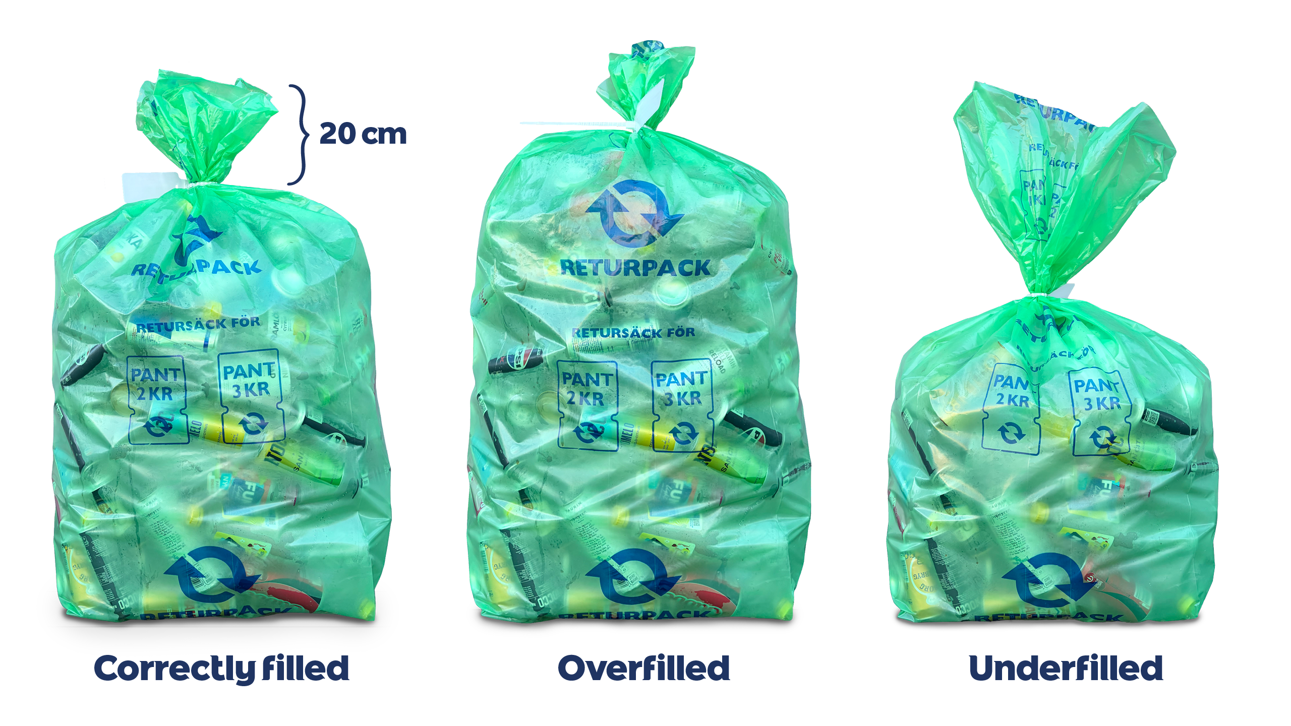 - Fill each bag so that approximately 20 cm remain to the top of the bag when it is sealed (see image below).